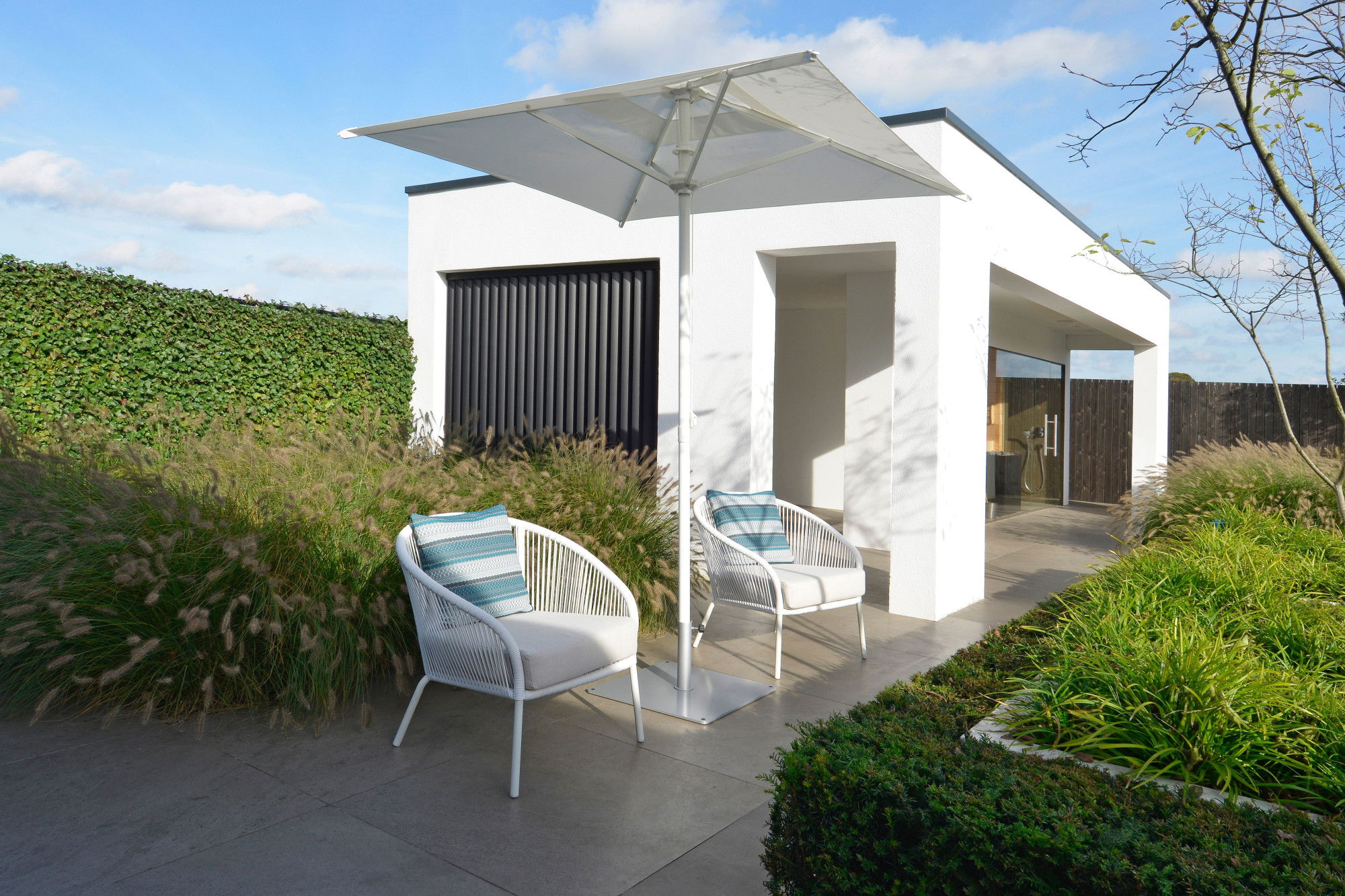 The Florida parasol has a white aluminium frame with a Sunbrella or Batyline canvas. Sunbrella and Batyline are solution dyed, UV resistant, and offer a high level of colourfastness. The pole of the Florida parasol consists of a single unit with four pulleys for opening and closing the parasol. This parasol is available in sizes 350 cm Ø, 200×200 cm and 300×300 with a canvas in the colour Sunbrella white, or with a Batyline canvas in the colour white. The Florida parasol can be combined with a protective cover and various parasol bases from the Borek collection.