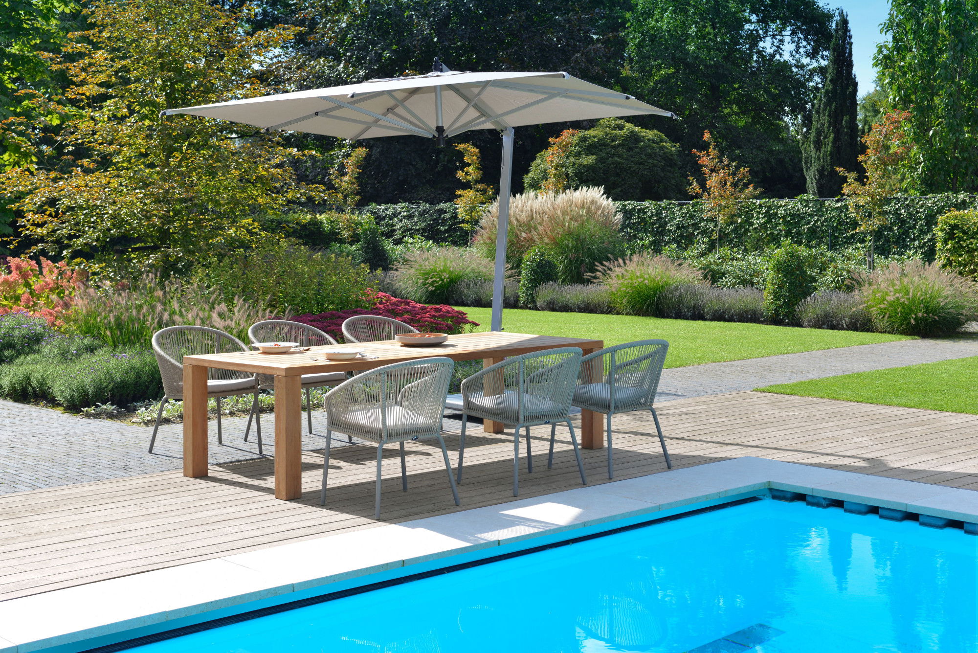 The Ischia is a cantilever parasol with a silver, white or graphite aluminium frame, or a silver aluminium frame combined with teak and a Sunbrella or Batyline canvas. Sunbrella and Batyline are solution dyed, UV resistant, and offer a high level of colourfastness. The Ischia parasol has a twist mechanism for opening and closing the parasol. The Ischia can be tilted, or rotated 360°. This parasol is available in sizes 340 cm Ø, 280×280 cm and a 250×375 cm oval with a Sunbrella canvas in the colours white, taupe, black, yellow, graumel blé, graumel beige, caillou cocoa or sooty, or with a Batyline canvas in the colours white, coffee, or black. The Ischia parasol is supplied with a cross leg base and can be combined with a protective cover, 95 kilo concrete base on castors, a concrete base, or terrace base from the Borek collection.