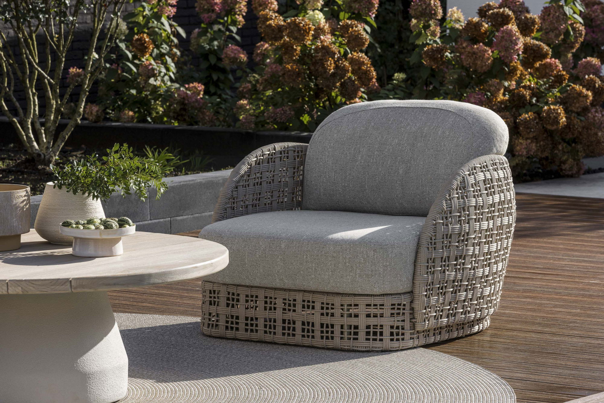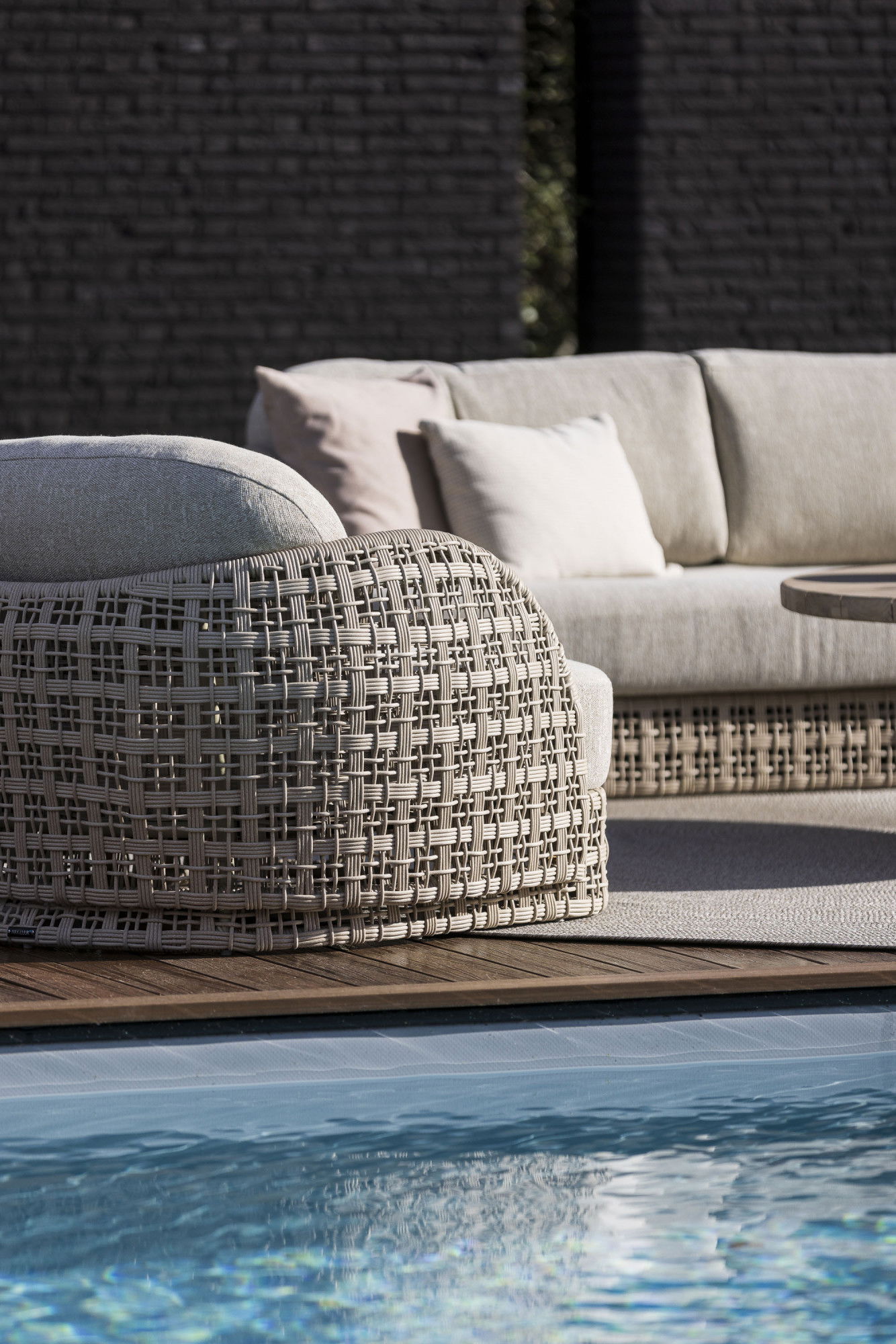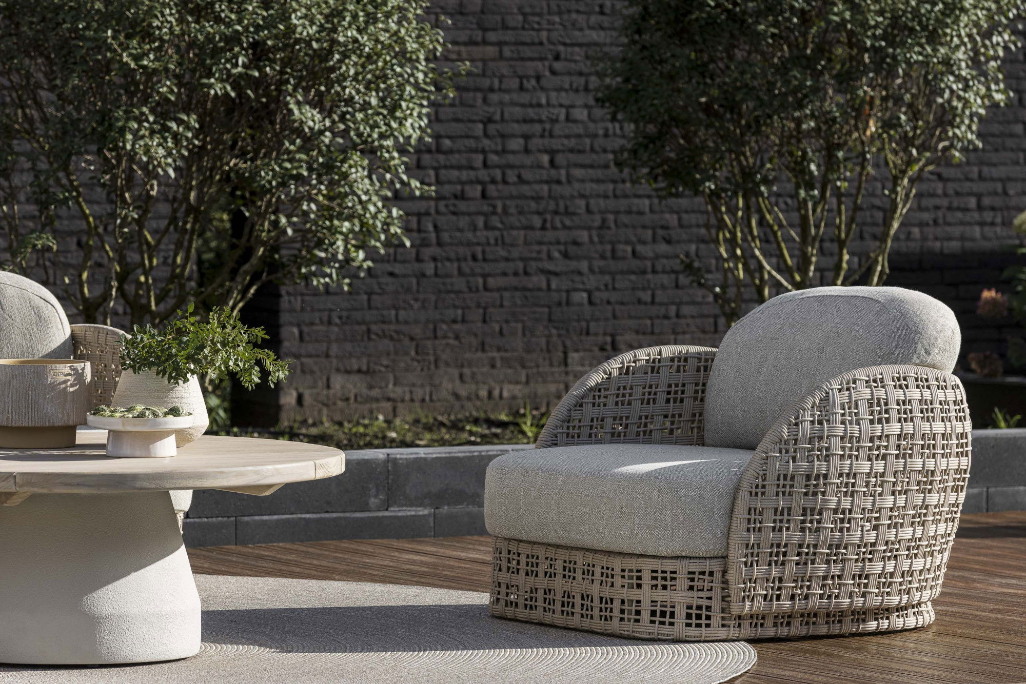 Orvieto brengt een nieuw gevoel van zachtheid naar de buitenruimte. De collectie, bestaande uit een lounge chairen een sofa, kenmerkt zich door een afgeronde vormentaal die onmiddellijk een rustige en uitnodigende sfeer creëert. De basis van fiberin de kleur white shell heeft een open structuur die lucht doorlaat en licht vangt, waardoor de meubels een bijna zwevende lichtheid krijgen. Het vlechtwerk is modern en grafisch, maar voelt tegelijkertijd warm en ambachtelijk aan.