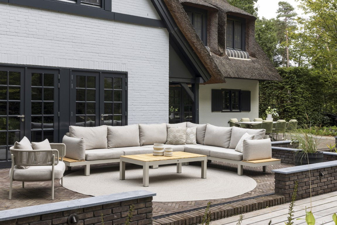 Een low dining table biedt extra functionaliteit en kan perfect worden gecombineerd met de sofa. Het sportbankje zorgt voor extra zitruimte en kan worden geschoven onder de low dining table wanneer niet in gebruik. Bijzettafels van fraai plantageteak en alle Midori-elementen helpen bij het inrichten van een perfecte buitenruimte in de tuin, met alle gewenste functionaliteiten