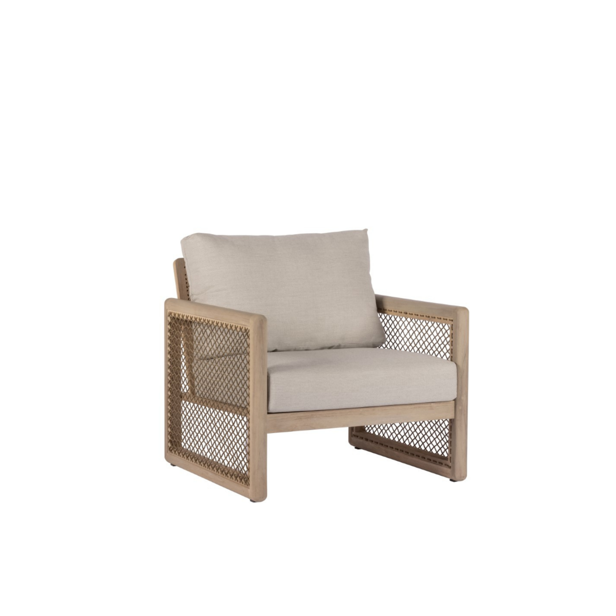 Der Brain Low Armchair mit Aged Teak Teak-Finish und kamelfarbenem Seil bietet eine robuste und elegante Ergänzung für Ihren Außenbereich. Sein robustes Erscheinungsbild, gekennzeichnet durch stabile gerade Formen und von Hand geflochtenes Seil in einem Rautenmuster, schafft ein charakteristisches Design. Der Teakholzrahmen fügt ein luftiges Element mit schönen Rundungen hinzu. Der Sessel bietet ein geräumiges und entspanntes Sitzerlebnis mit zwei großen weichen Rückenkissen an der leicht nach hinten geneigten Rückenlehne. Das hellgraue Sitzkissen sorgt für zusätzlichen Komfort. Der Brain Low Armchair ist perfekt als eigenständiges Möbelstück oder als Teil einer koordinierten Außeneinrichtung.