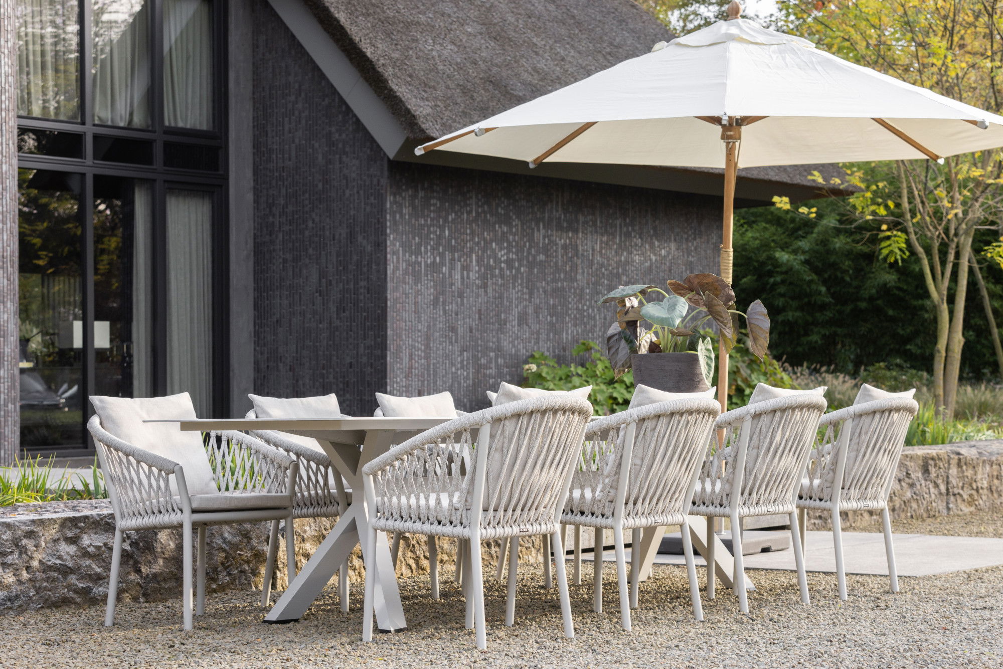 The Majinto chair from Borek combines elegance with comfort in a beautiful design. Inspired by the popular Colette chair, the Majinto has an aluminium frame with a wide, open braided belt for an airy look. Seat and back cushions are available for extra comfort. This versatile chair matches perfectly with wooden tables from collections such as Sevilla, as well as the Faro table with a Dekton top. Besides the chair, a low armchair, low bench and high dining chair are also available. Designed by Studio Borek.