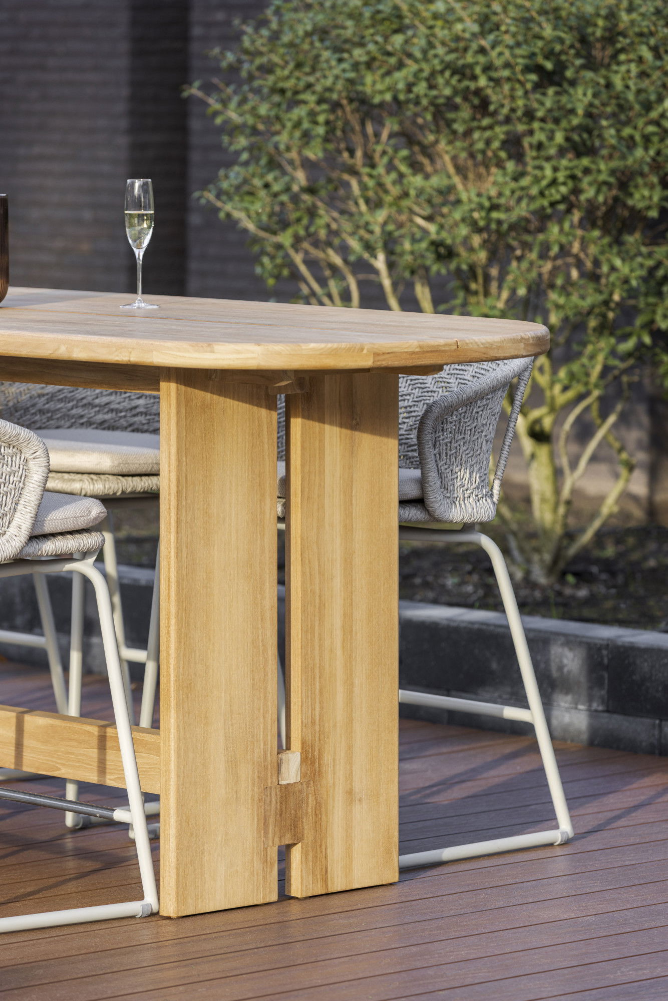 The Calobra collection offers a contemporary interpretation of solid teak wood by playing with soft curves, generous volumes and visible layering in the material. The tabletop consists of two elegantly shaped parts that together create a flowing, inviting contour, while the characteristic wide table legs, placed in close proximity to each other reinforce that feeling of layered architecture. The result is a collection that exudes tranquillity without being bland and, thanks to its friendly curves, fits in perfectly with the organic trend in outdoor design.