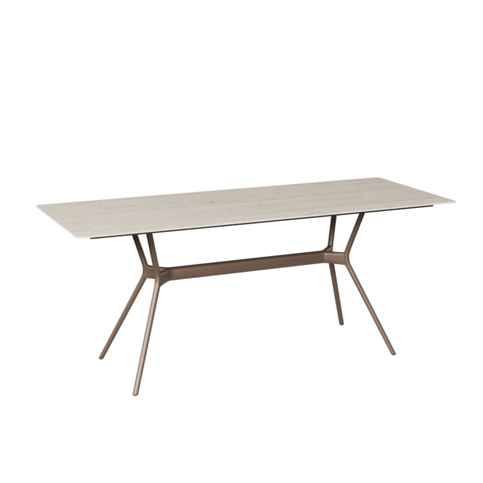 The Julia high dining table brings style and comfort to your outdoor space. At 230 cm long, this table creates a sophisticated setting at height, perfect for cozy get-togethers or relaxing lounge areas, where comfort and design come together. The rectangular ceramic top rests on slender, inward-facing round legs, creating an elegant look. Available in Ceppo or Marmorio finishes and frame colors Lava, Linen and the new Bronze, the table fits perfectly with a variety of styles. Combining contemporary design with versatility, the Julia high dining table invites you to enjoy it in style.