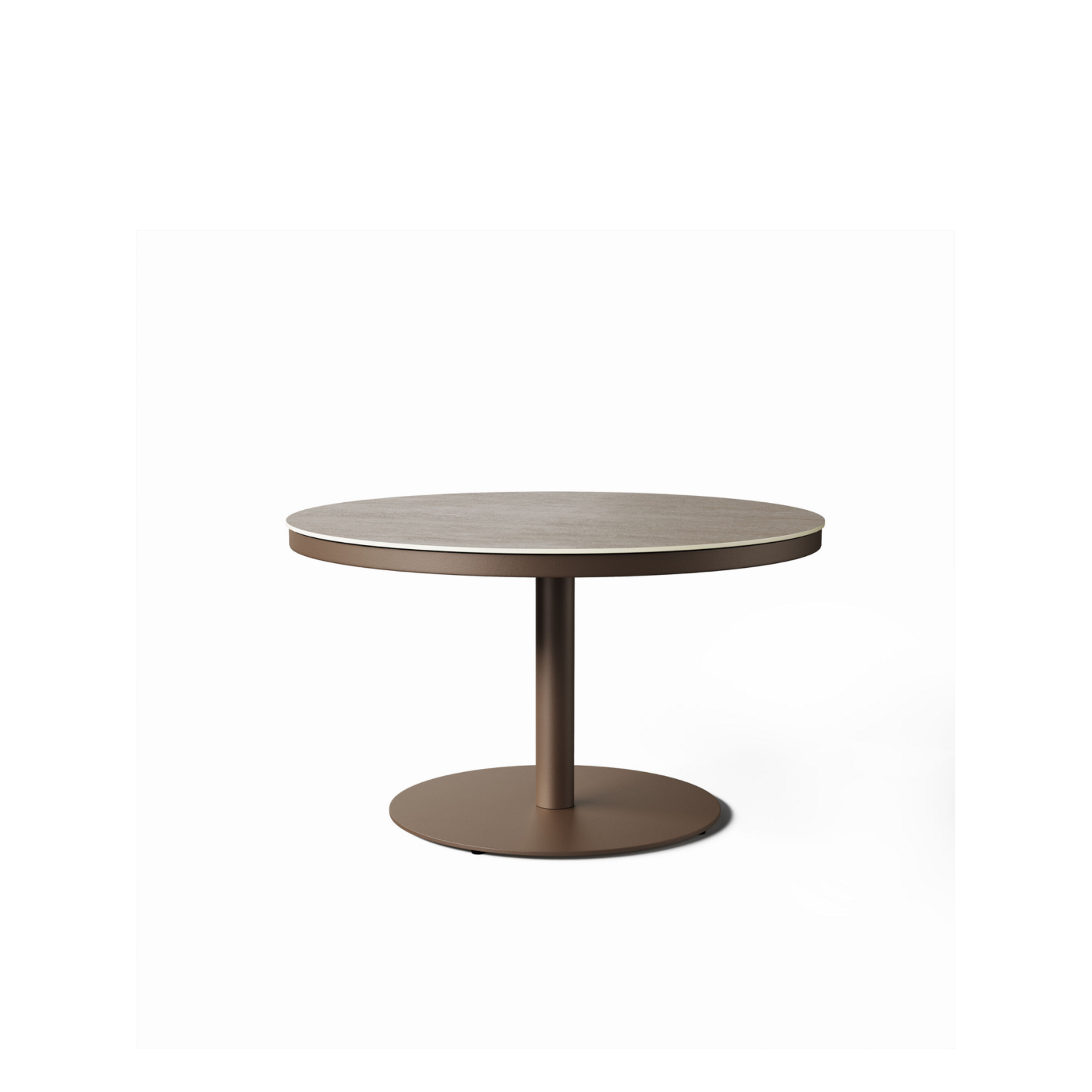 The Salerno low dining table has an elegant round shape. The ceramic table top in a travertine color has a tactile texture that gives it the appearance of real natural stone, making the table interesting both visually and tactile. Ceramic offers the Salerno table numerous advantages: it is extremely durable, scratch-resistant and highly resistant to weathering, making this table perfect for both indoor and outdoor use. The top retains its beauty even after prolonged exposure to the elements. The aluminum base is available in both Linen and bronze shades, making the Salerno table easy to pair with a variety of chairs, from modern designer chairs to more classic models. The low tables in the Salerno series can also be playfully combined with each other to create a dynamic table arrangement. Thus, Salerno not only adds style and functionality to your space, but also offers endless possibilities to arrange your outdoor space or dining area to your liking.