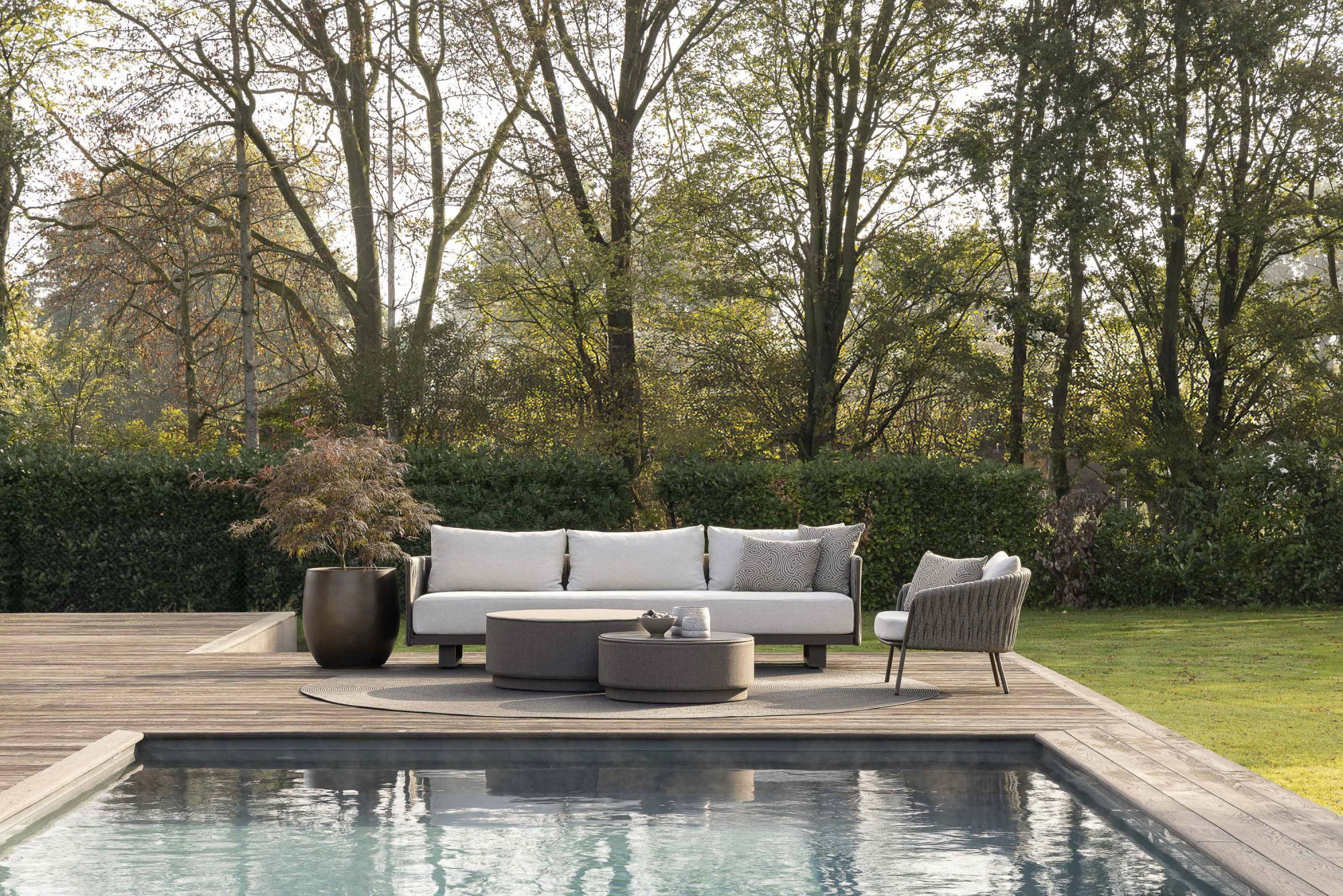 De Loreto tafelserie vormt een stijlvolle aanvulling op de lounge. De collectie omvat bijzet-, lage, dining- en high dining tafels, waaronder ovale uitvoeringen met geïntegreerde wijnkoeler. De verfijnde vormen en hoogwaardige afwerking creëren een elegant samenspel tussen functionaliteit en design, ideaal voor wie buitenleven wil ervaren in zijn meest verfijnde vorm.
