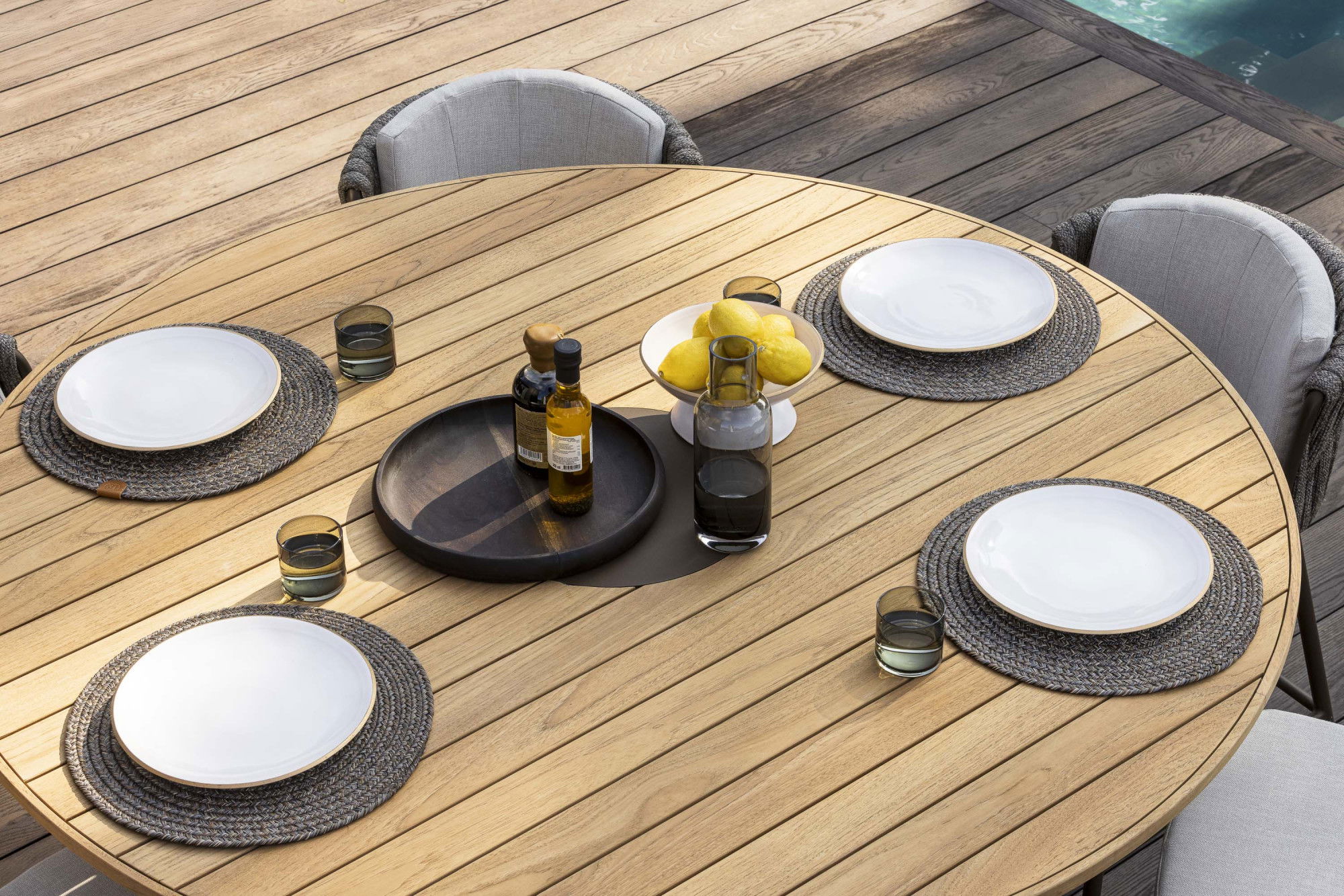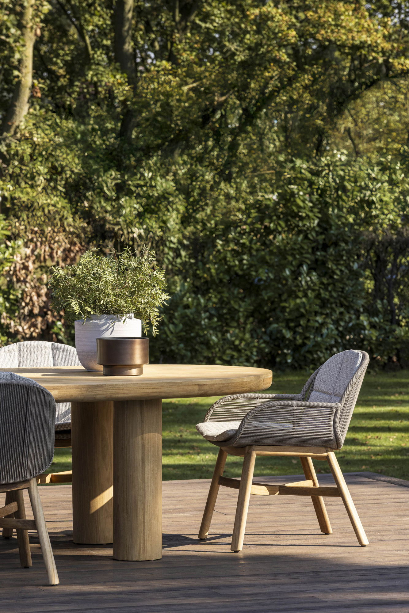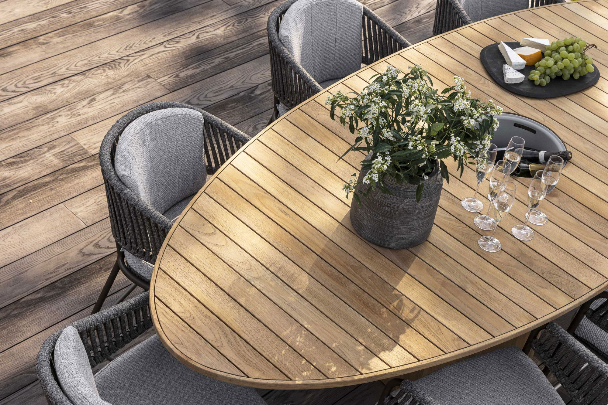 De nieuwe Bolzano teak tafel volgt de trend van vloeiende lijnen en natuurlijke vormen. Het teardrop-vormige blad rust op robuuste ronde teakpoten en straalt pure ambacht en balans uit. Verkrijgbaar in dining en low dining uitvoering, vormt Bolzano het sculpturale middelpunt van iedere buitenruimte.